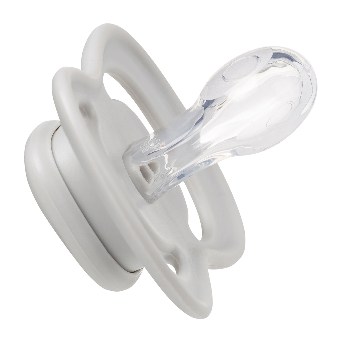 Der intuitive, symmetrische Silikonsauger ist so geformt, dass er Mamas Brustwarze beim Stillen nachahmt. Hergestellt aus medizinischem Silikon ist er langlebig, leicht zu reinigen und sicher für das Baby. Erhältlich in zwei Größen, um Babys von Geburt an zu beruhigen.